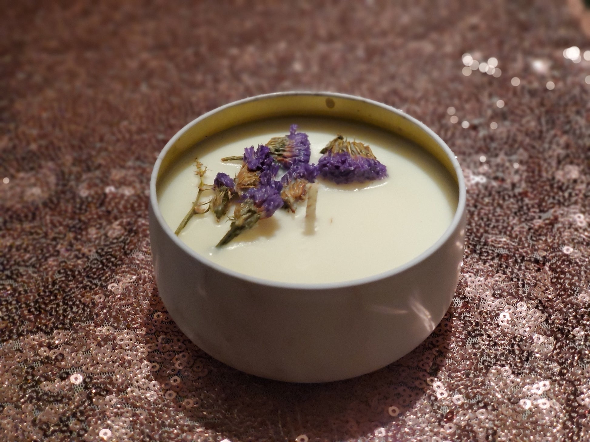 Coconut soy wax, essential oils, non-toxic candle dye, and dried flowers