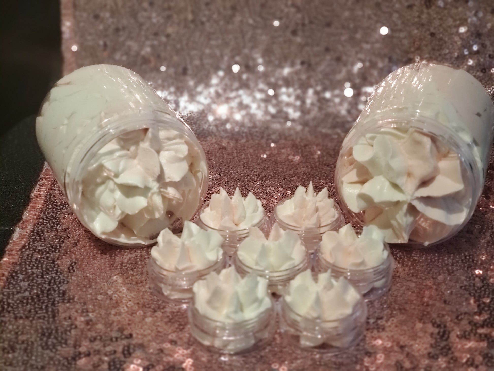 Shea butter, kokum butter, sweet almond oil, sunflower seed oil, avocado oil, apricot kernel oil, rice bran oil, vitamin E oil, preservative (optiphen) mica powder, fragrance oil (floral and fruity), arrowroot powder.