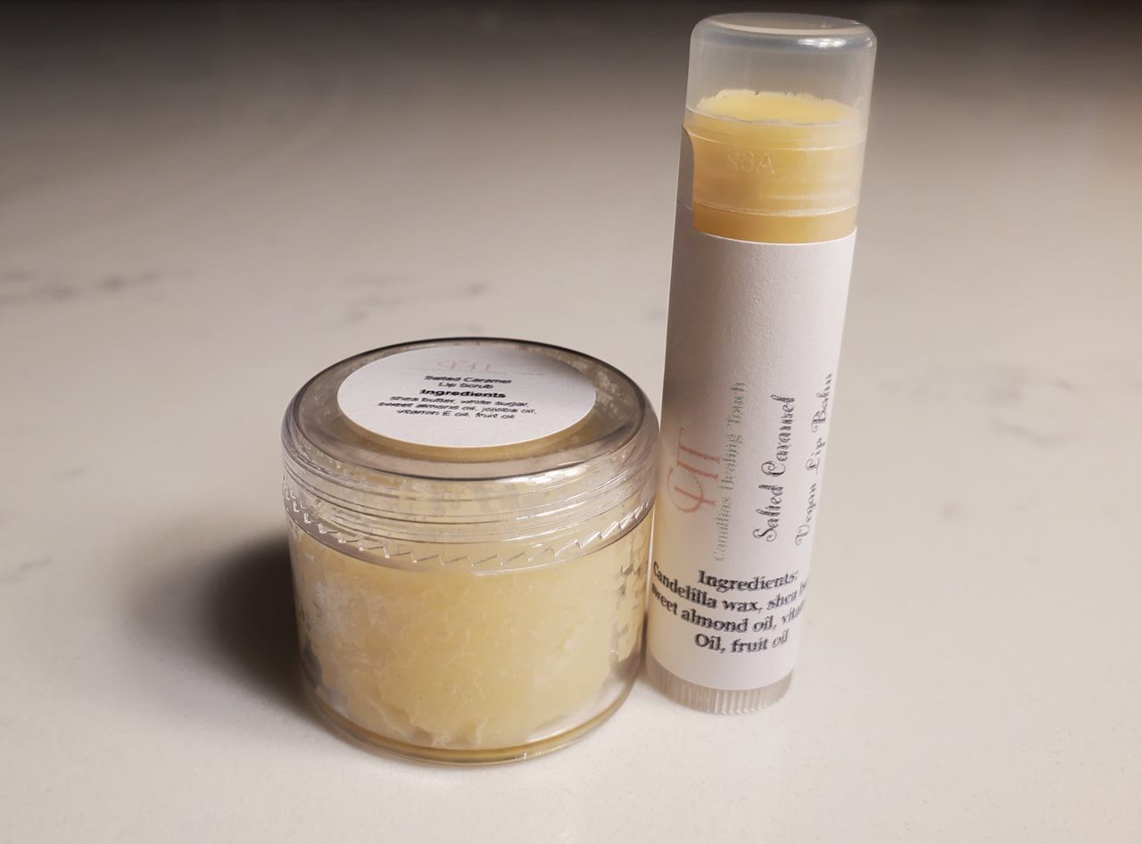Our lip balms leave you lips moisturized and soft with a hint of shine. All of our lip products are vegan. Ingredients used are candelilla wax, shea butter, sweet almond oil, white sugar, and fruit oil.